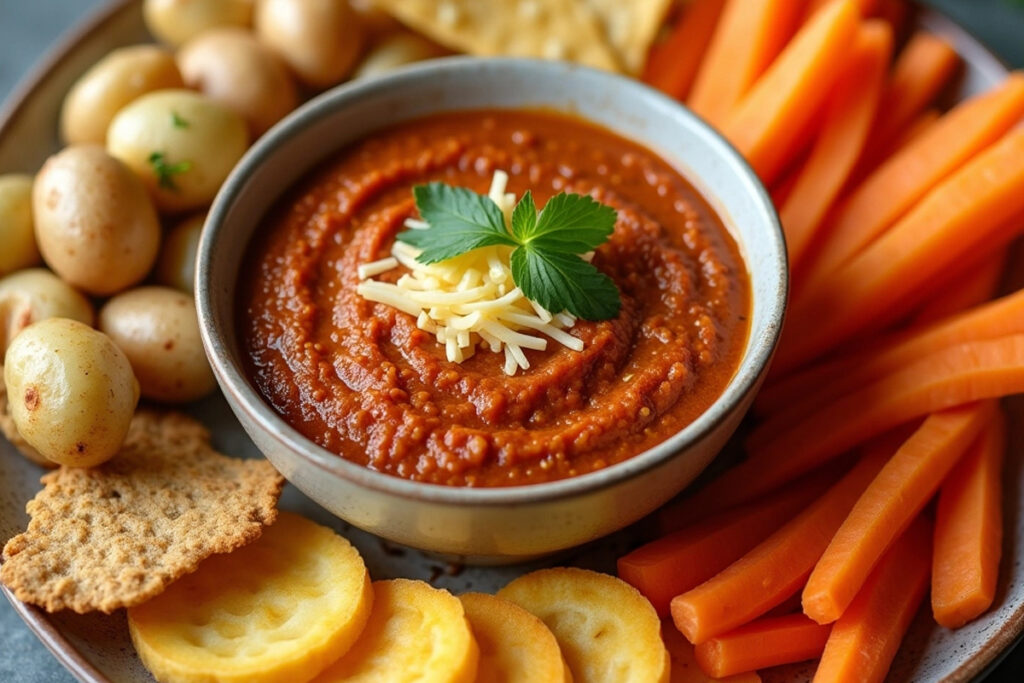۵- در یک کاسه سس پستو چیلی دلوسه را ریخته و سیب زمینی ، نان ترتیلا ، پنیر کبابی و سبزیجات را دور آن بچینید و همراه با سس پستو چیلی دلوسه میل نمایید